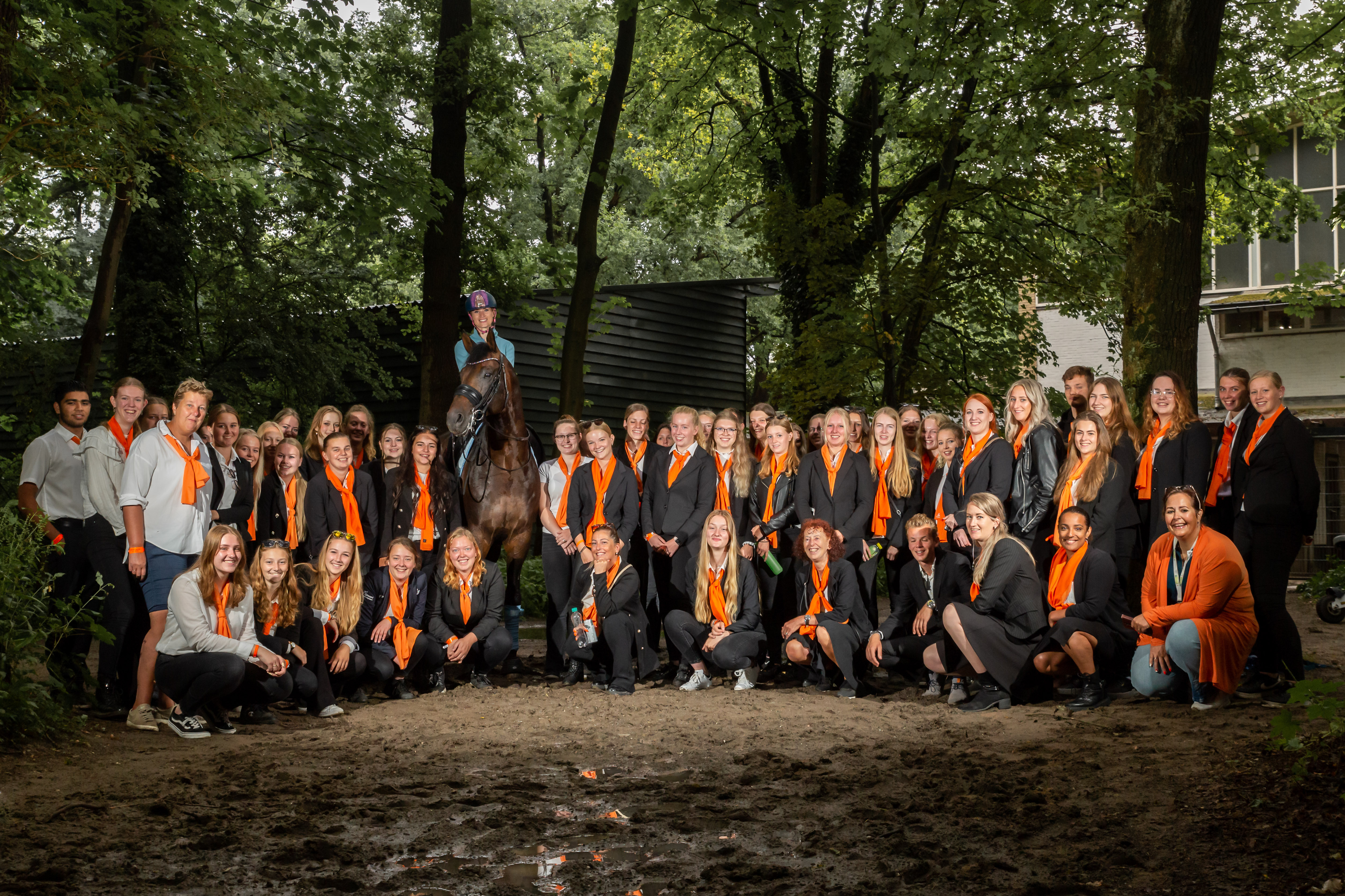 “Over Rotterdam gesproken, een paar jaar geleden vroeg een team van jullie om met mij op de foto te gaan voor een groepsfoto. Ik stelde voor Hermès mee te nemen. In het bos, een hele groep mensen om hem heen, lichtschermen, flitsen, hij heeft 10 minuten doodstil gestaan met zijn oortjes naar voren. Daar geniet hij van, hij is een soort arrogant, hij houdt ervan om in de belangstelling te staan. Zo kan hij als ik een proef moet rijden best iets gespannen zijn als we net de ring binnen komen, maar prijsuitreikingen vindt hij geweldig.
