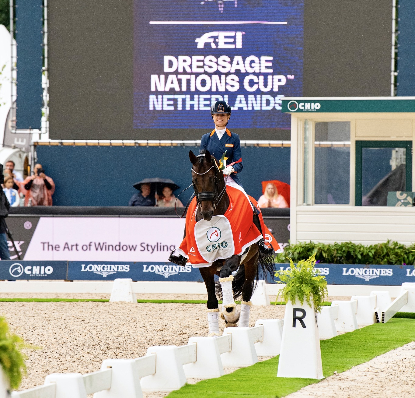 Dinja: “Ik was best gespannen voor het NK, omdat ik heel graag wilde dat het goed ging. Hermès was na zijn blessure nog maar één keer mee geweest en dan meteen een wedstrijd die niet alleen het Nederlands Kampioenschap was, maar ook telde als observatie voor Parijs. Dat laatste is voor mij eigenlijk nog belangrijker. Ik wilde niet zo zeer die Nederlandse titel, ik wilde vooral laten zien dat Hermès echt weer terug is en hoe fit hij is. Ik wilde mooie, ontspannen proeven rijden. Hermès speelt met de oefeningen, maar om die hele hoge scores te behalen is meer nodig. Ik ben tevreden. In de Grand Prix Special had ik nog een klein foutje, maar verder heb ik denk ik een mooi, ontspannen beeld kunnen laten zien.”